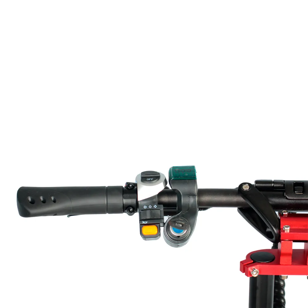 Органы управления электросамоката (газ, тормоз) расположены на рулевом механизме, текущая информация (скорость, заряд аккумуляторной батареи) отображаются на дисплее.