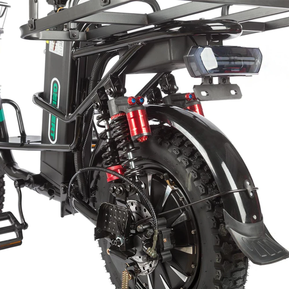 Электровелосипед Eltreco Gelbert Khan Monster 1 – это современное средство передвижения, сочетающее в себе продуманную конструкцию, передовые технологии и стильный дизайн для уверенных городских и пригородных поездок.Модель оснащена передним и задним амортизаторами, которые эффективно смягчают неровности дороги, обеспечивая плавность хода и комфорт даже на пересеченной местности. При заявленном максимальном пробеге до 100 км на одном заряде этот велосипед подходит для длительных поездок – конечно, реальные показатели зависят от веса райдера, рельефа местности, погодных условий и температуры окружающей среды.Безопасность обеспечивается за счет дисковых гидравлических тормозов, которые гарантируют надежное и своевременное торможение в любых ситуациях. Легкий вес в 57 кг позволяет легко маневрировать, а максимальная нагрузка до 150 кг делает модель универсальной для разных категорий пользователей.Двигатель мощностью 240 W, размещенный в задней части, обеспечивает эффективное ускорение и оптимальное распределение энергии, что способствует стабильной работе в условиях городской среды. Электровелосипед оборудован аккумулятором с емкостью 21 Ah и рабочим напряжением 60 V, что гарантирует долгий срок службы батареи и надежную работу даже на длинных маршрутах.Габариты в собранном состоянии – 1700×1150×800 мм – обеспечивают удобное расположение для водителя, а использование качественной стали в конструкции гарантирует долговечность и надежность всей системы. Дополнительное оснащение включает зеркала заднего вида, которые повышают безопасность, а встроенные передние и задние габаритные фары обеспечивают отличную видимость в условиях недостаточной освещенности.Стоит отметить, что данная модель не является складной, что подчеркивает ее прочную и стабильную конструкцию, рассчитанную на долгосрочную эксплуатацию. Электровелосипед Eltreco Gelbert Khan Monster 1 – это оптимальное решение для тех, кто ищет сочетание высоких технологий, надежности и комфорта в одном устройстве.