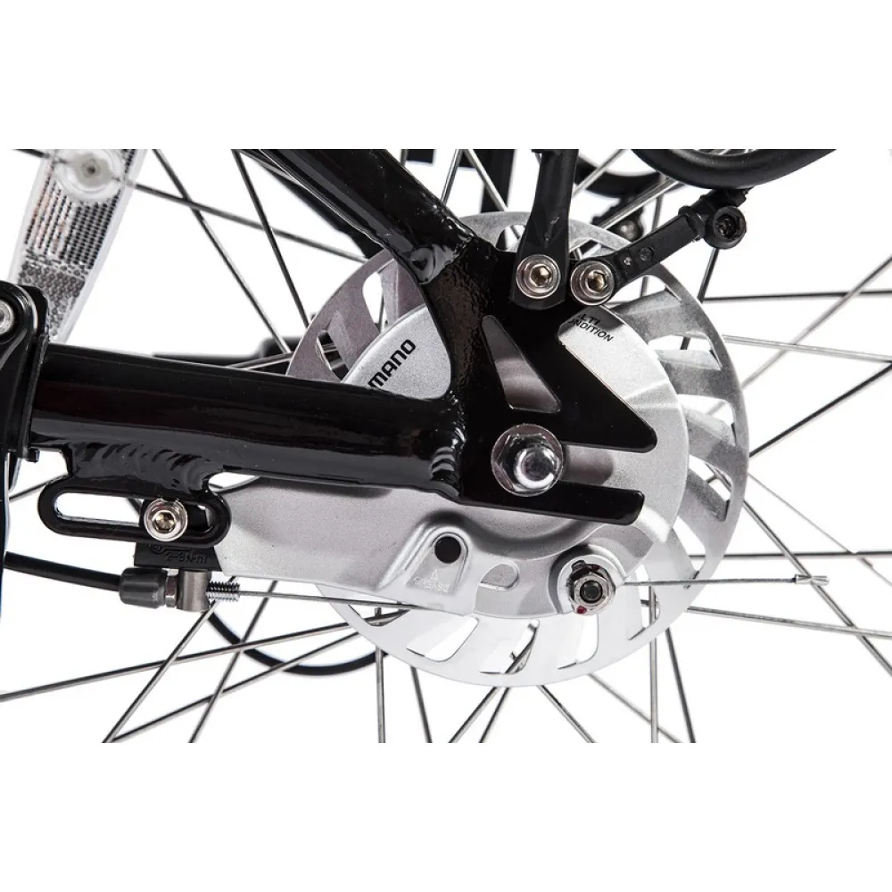 Система тормозов представлена в виде заднего роллерного и переднего дискового тормоза производства Shimano, за счет чего гарантируется уверенное торможение на дороге с любым покрытием.