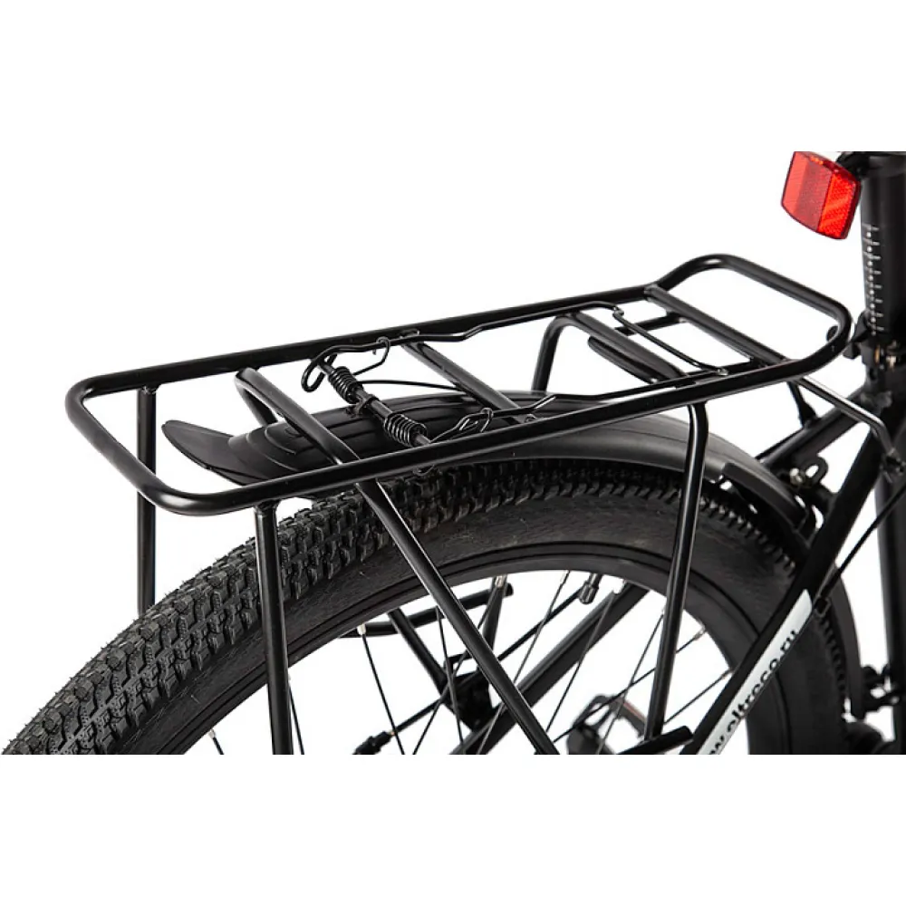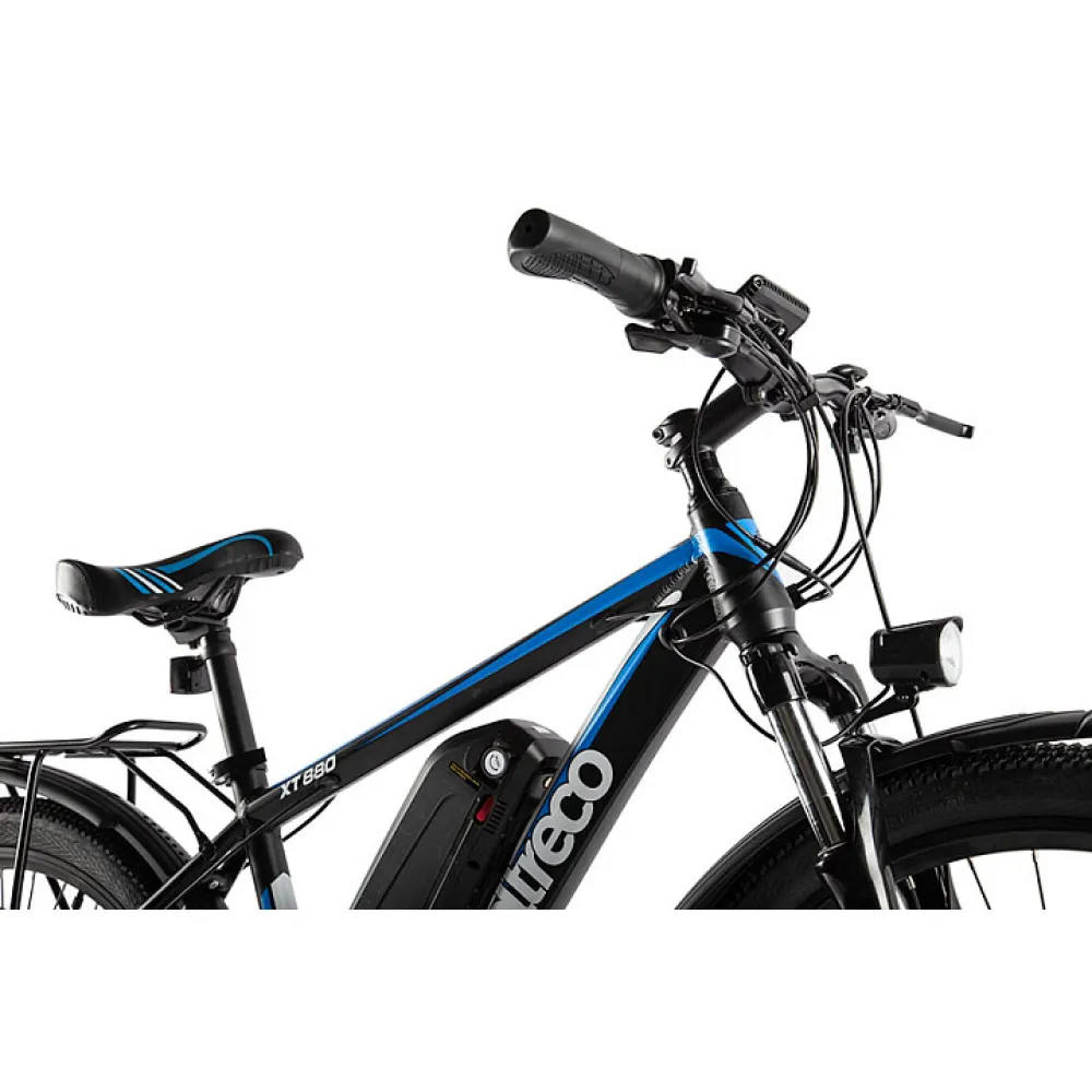 Велогибрид Eltreco XT880D - обновлённая модель от надежного российского производителя, в которой качество исполнения сочетается с комфортом эксплуатации. Электровелосипед создан для езды как по городским улицам, так и по горным и грунтовым дорогам. Мощный двигатель прямого привода обеспечивает плавный разгон до максимально допустимой отметки 35 км/час. Питает двигатель емкий литий-ионный аккумулятор, на полном заряде которого велогибрид способен преодолеть до 70 километров.  Аккумулятор расположен под рамой и легко снимается для более удобной подзарядки. Большие 27,5-дюймовые колёса и амортизатор обеспечивают мягкий и плавный ход при движении даже по неровной поверхности. Для комфортной поездки все детали электровелосипеда продуманы до мелочей. Улучшенное седло эргономичной формы обеспечивает удобную посадку, а прорезиненные ручки руля исключают соскальзывание рук во время совершения любых маневров. Благодаря складной металлической подножке велогибрид легко припарковать в любом удобном месте, даже если рядом нет никакой опоры. Велогибрид Eltreco XT880D оснащён крупным ЖК-дисплеем, с помощью которого райдер может отслеживать показатели скорости, пройденного расстояния и уровня заряда батареи.