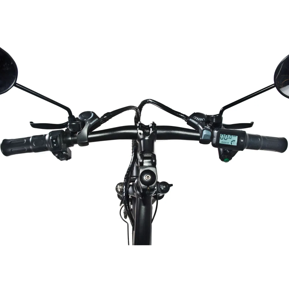 На руле находятся все управляющие элементы, но также там есть экран бортового компьютера, показывающий скорость, пробег и заряд аккумулятора, кнопки включения и выключения света и приятный бонус - зеркала заднего вида. Ещё из навески велосипед имеет стандартную амортизирующую вилку, мягкое большое сидение, передний фонарь и задний стоп-сигнал.