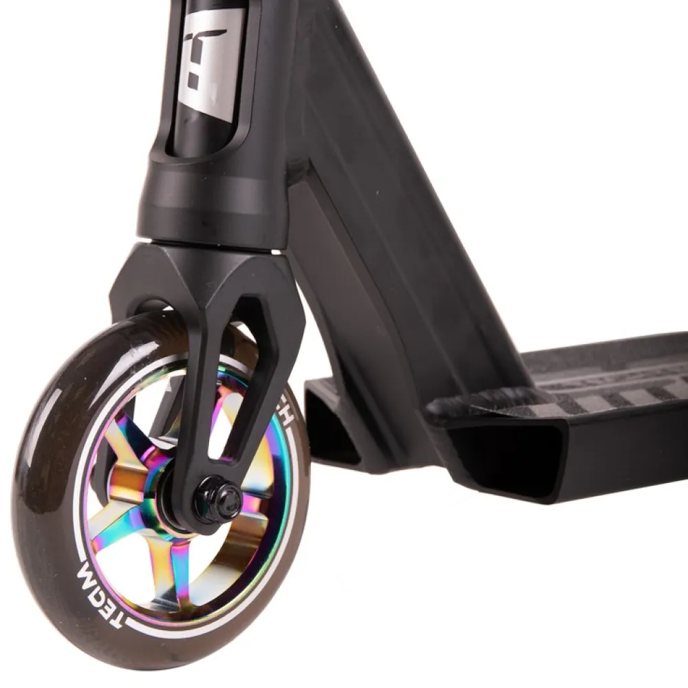 Техника представлена облегченной конструкцией. Весит 3,8 кг. Минималистичная и эргономичная, послушная в управлении. Т-образная часть руля изготовлена из хроммолибденовой стали. Высота руля от зажима и от поверхности составляет 61,5см и 85 см соответственно. Ширина – 54 см и диаметр 34,9 мм удобные для хвата, не провоцируют усталости при длительной эксплуатации техники. Дека размерами 49х12 см изготовлена из высокопрочного алюминиевого сплава, нескользящая, исключает случайные действия в виде соскальзывания стоп. Оснащенность модели конкейвом обеспечивает безопасность, позволяет контролировать собственные действия во время прыжков, выполнения других элементов трюкачества. Накатистые полиуретановые колеса с сердечником 110х24мм оснащены современными подшипниками, обеспечивают максимальный разгон, важный для каждого трюкача. Для заказа трюкового самоката предлагаем связаться с нашим менеджером.